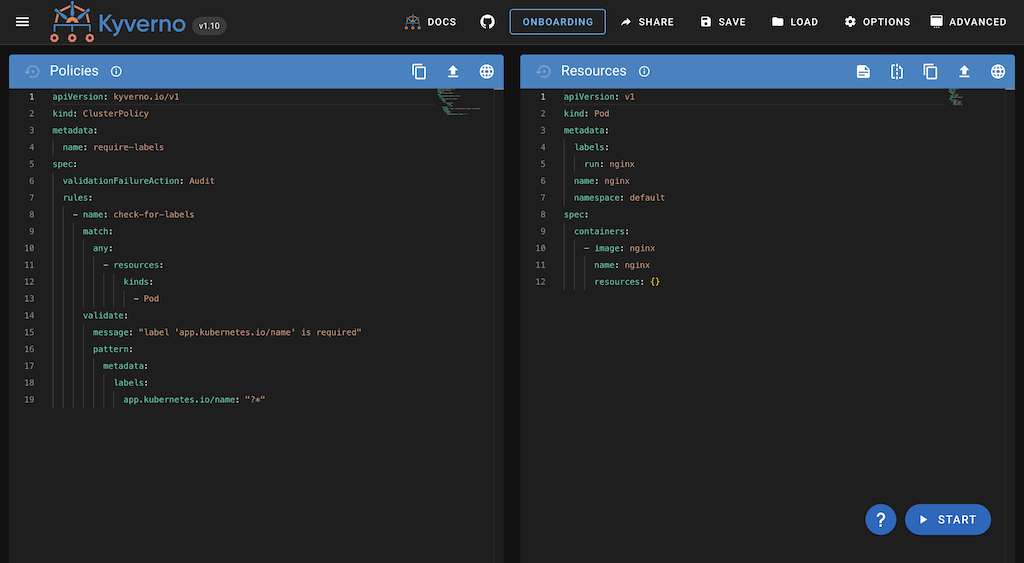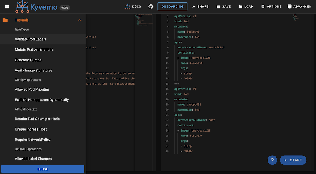 In order to give new users an interactive overview of what Kyverno can do and how different use cases can be achieved within the Playground, we decided to include a small sample library based on the extensive Kyverno Policy Repository. The examples provide a set of predefined policies and related resources and configurations for common use cases such as the Pod Security Standards and Best Practices.